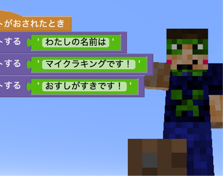 大人気ゲーム「マインクラフト」の世界で、ブロックを置いたり、あるいは消したりしながら楽しくプログラミングでゲームを作っていきます。Scratchを元に作ったオリジナルツール“マイクラッチ”で、マイクラの新しい楽しみ方を体験してください。